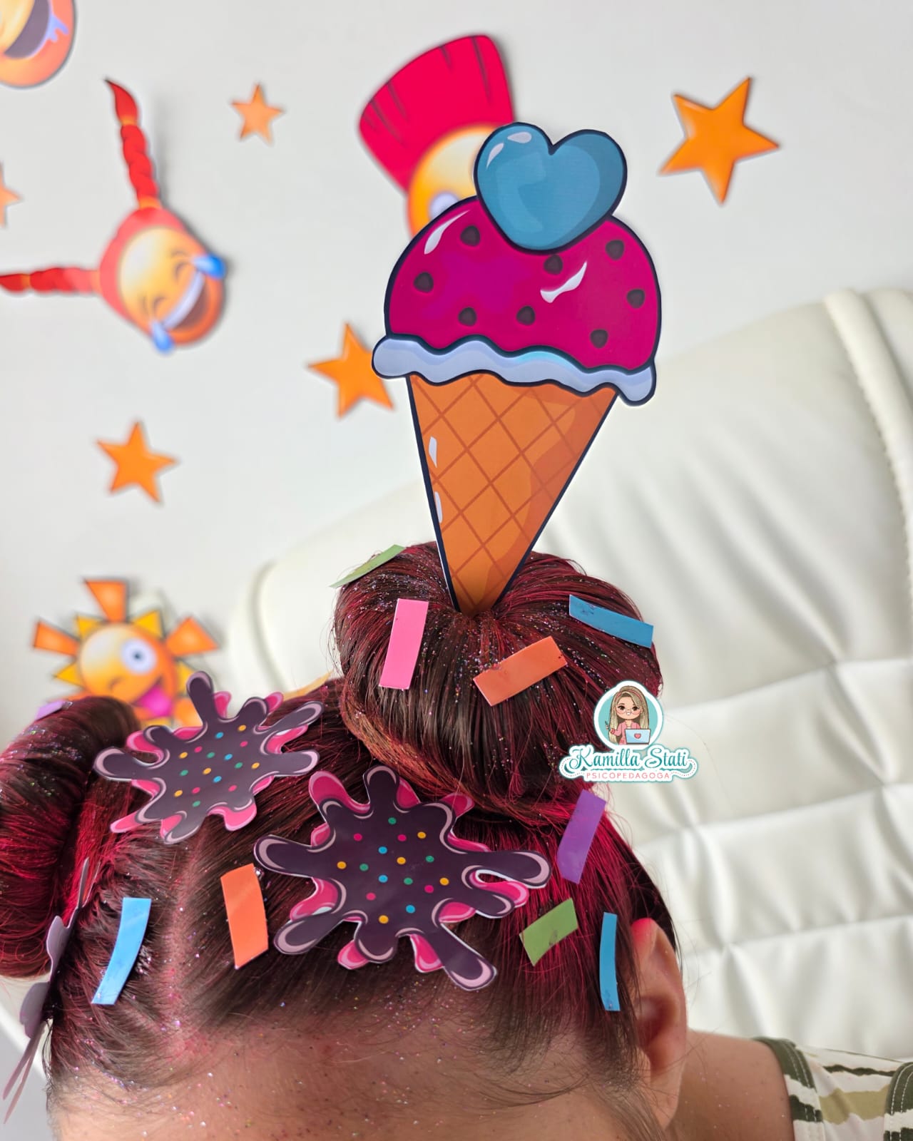 ✅️Composto por um par de sorvetes, colei um palito atrás para encaixar no coque. E os apliques do cabelo passei gel para grudar.