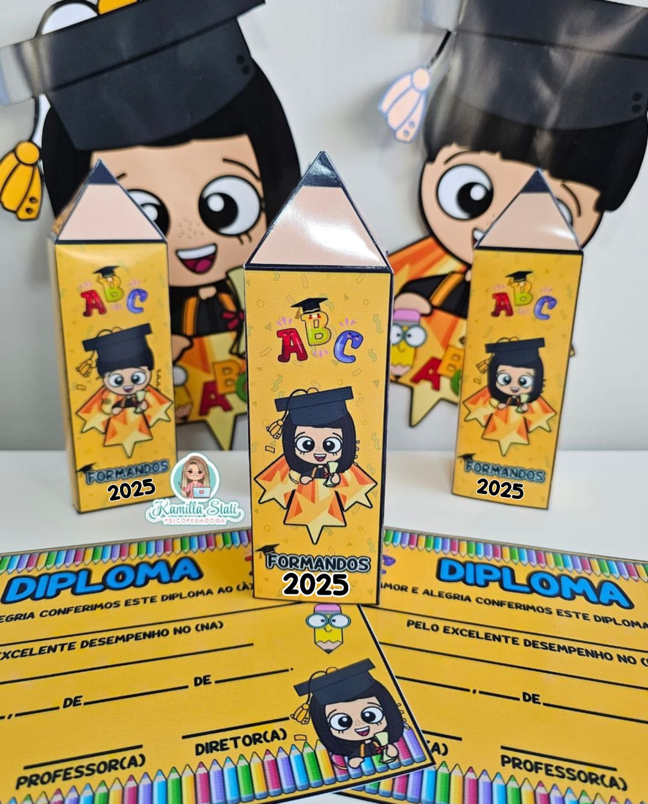 Dê aos pequenos formandos uma lembrança especial e divertida! Este kit completo com capelo, lembrancinha e diploma é perfeito para encerrar o ano letivo com muita alegria e recordações.