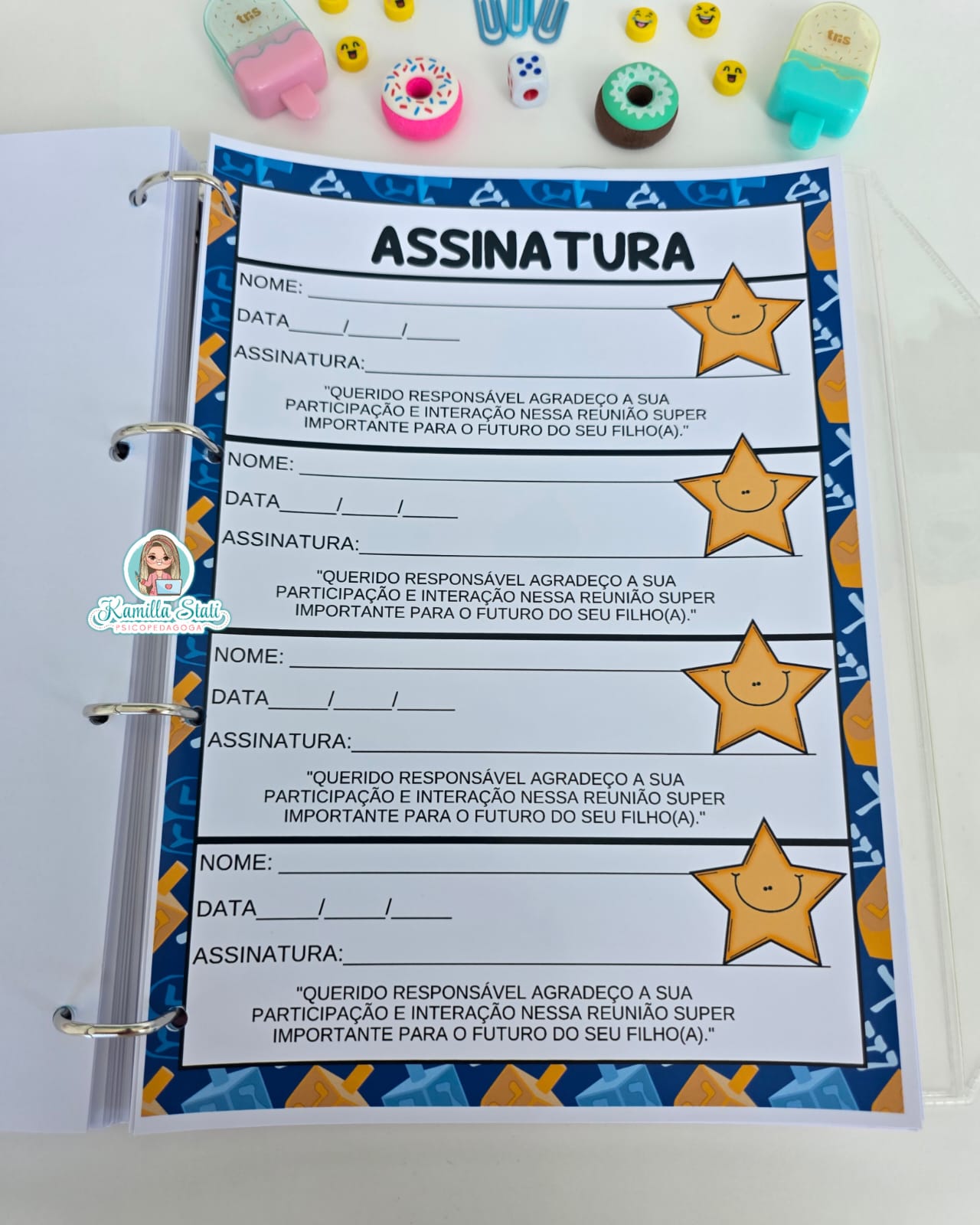 ✅ Seções para reuniões de pais: pauta da reunião, observações e assinaturas.